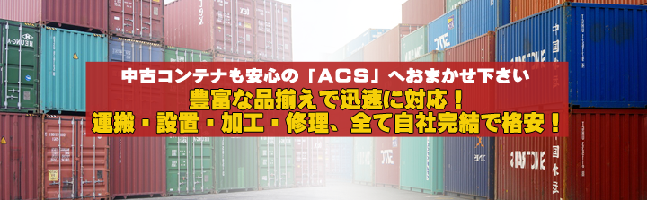 倉庫や物置など用途に合わせて活用できる海上コンテナの販売ならACSへおまかせください。お客様のご要望にあわせたサイズ、数量から納期、予算までお気軽にご相談ください。各種、事業主様の大量発注はもちろん個人のお客様の1本単位の販売まで、全国各地へ設置販売致します。